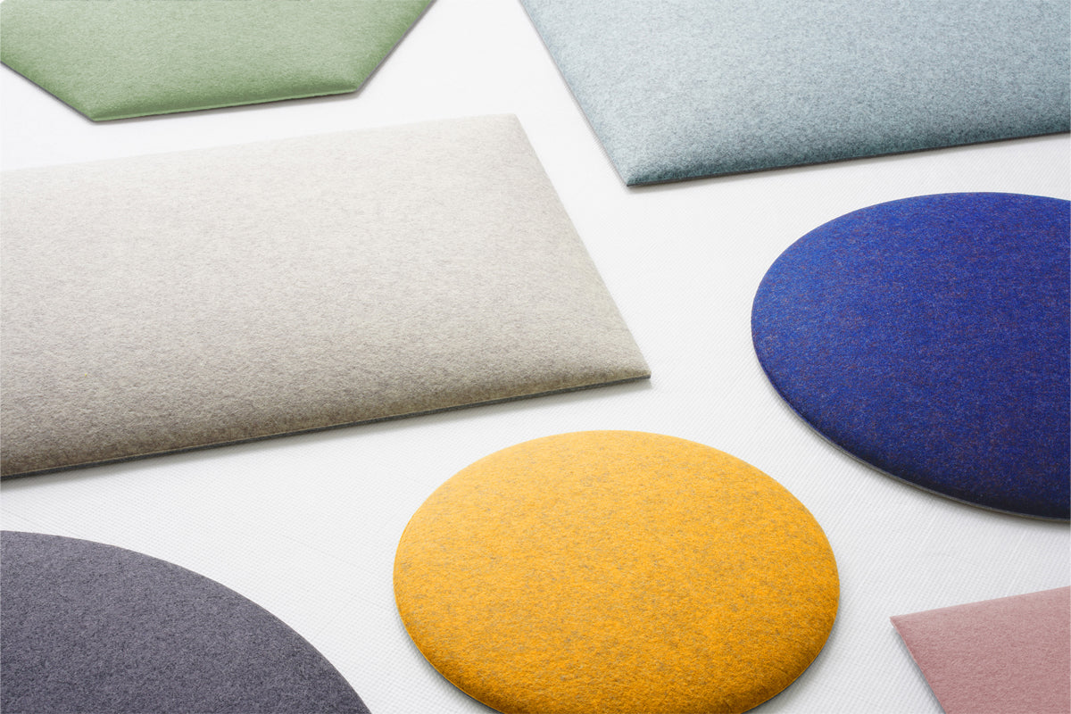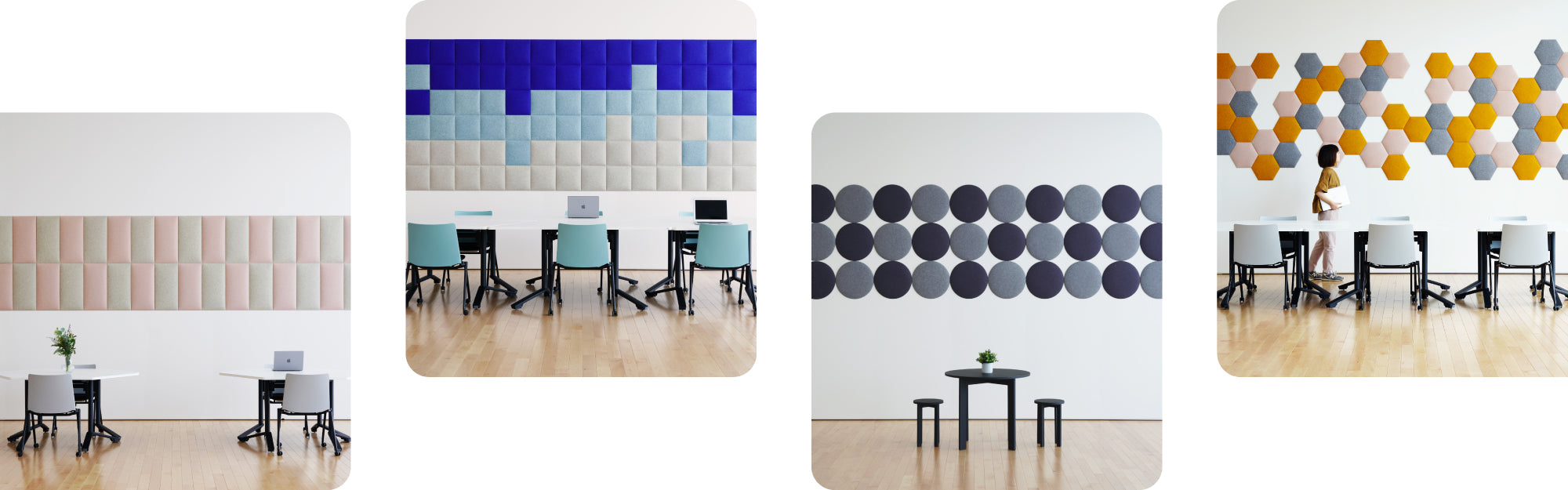 吸音材というと、いかにもなオフィス用品という地味なものが多いイメージだったので、ここまでポップなものがあるとは知りませんでした。1枚あたりが小さめのものもあるので、作例のように2色でグラデーションを作ったりと凝った配色にできる点も魅力的ですね。会社に紹介してみようと思います。