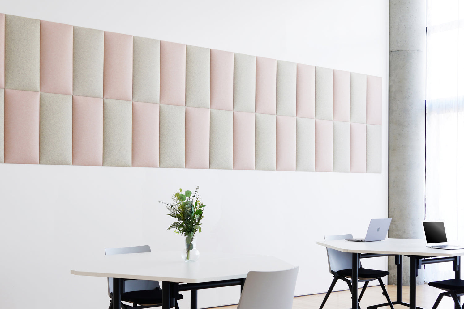 3色のカラーを組み合わせて、目を引くウォールパネルとして使用。30cm×30cmのサイズはピースが細かいので、グラデーションのような多彩なデザインが可能です。多くの枚数を貼ることで吸音効果もしっかり感じていただけます。