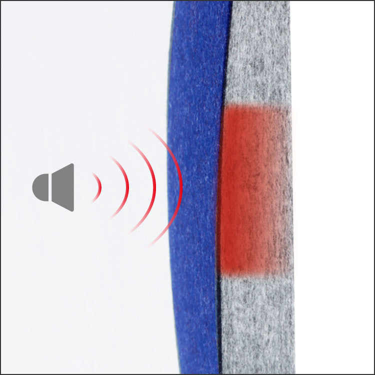 材料には独自開発のポリエステル繊維を使用。表面のフェルトで音が通る時の力を分散し弱め、更に入ってきた音を極細の繊維に閉じ込めます。閉じ込めた音波は微弱な熱エネルギーに変換され、吸収されます。フェルト生地と高密度極細繊維の2層構造で音を逃がしません。