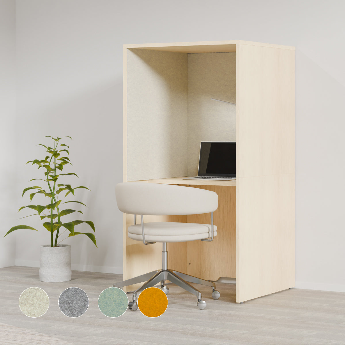 三方の壁に吸音パネルを使い、周りの音を気にせず集中できるこもり空間としてご使用頂けます。テレビ会議などでの音の反響を抑え、相手に聞こえる音も改善することが出来ます。また吸音材を使い音を和らげるので、完全な個室とは違った半個室スペースとなり、周囲の人とのちょどいい距離感・パーソナルスペースを生み出します。表面はフェルト繊維になっているため、ピンでメモなどを掲示しても穴が目立ちません。安心と信頼の日本製です。