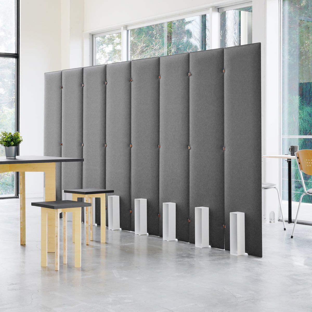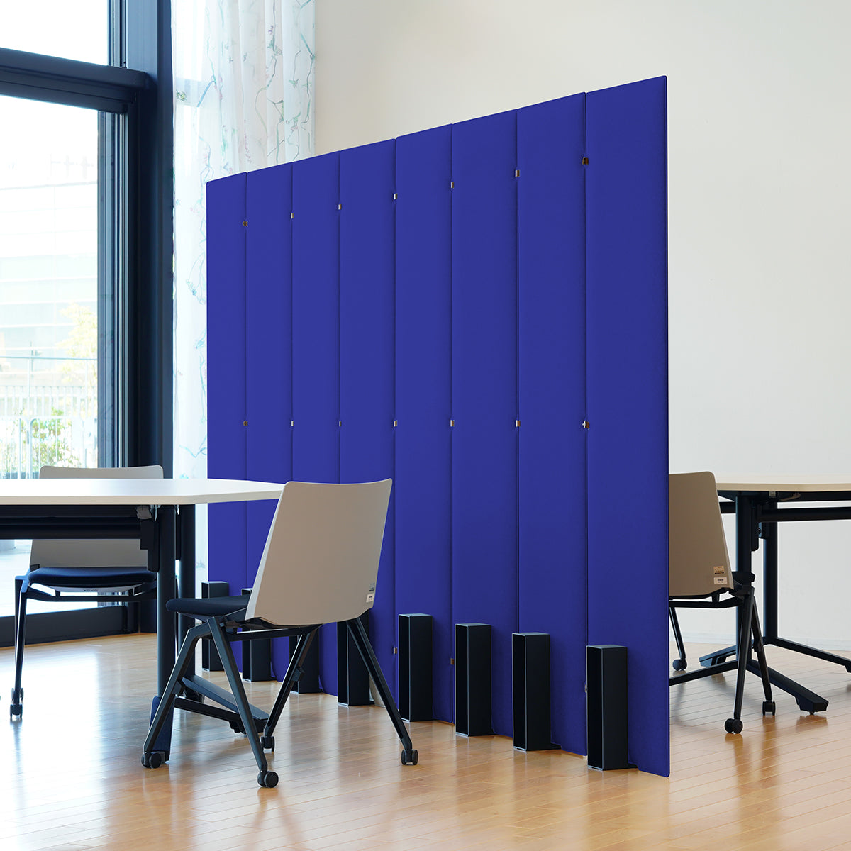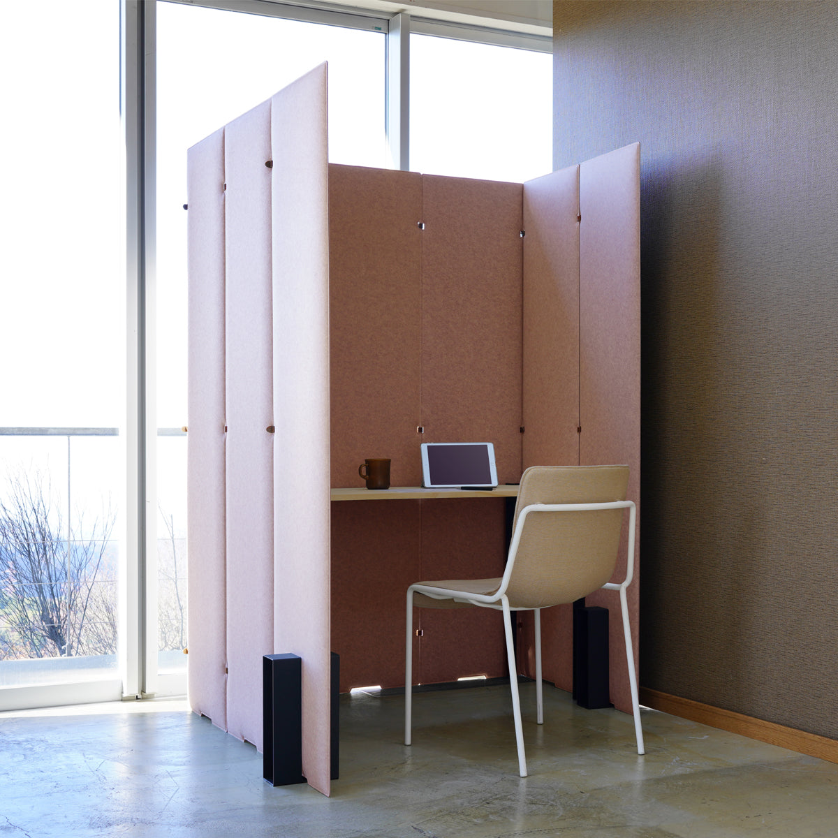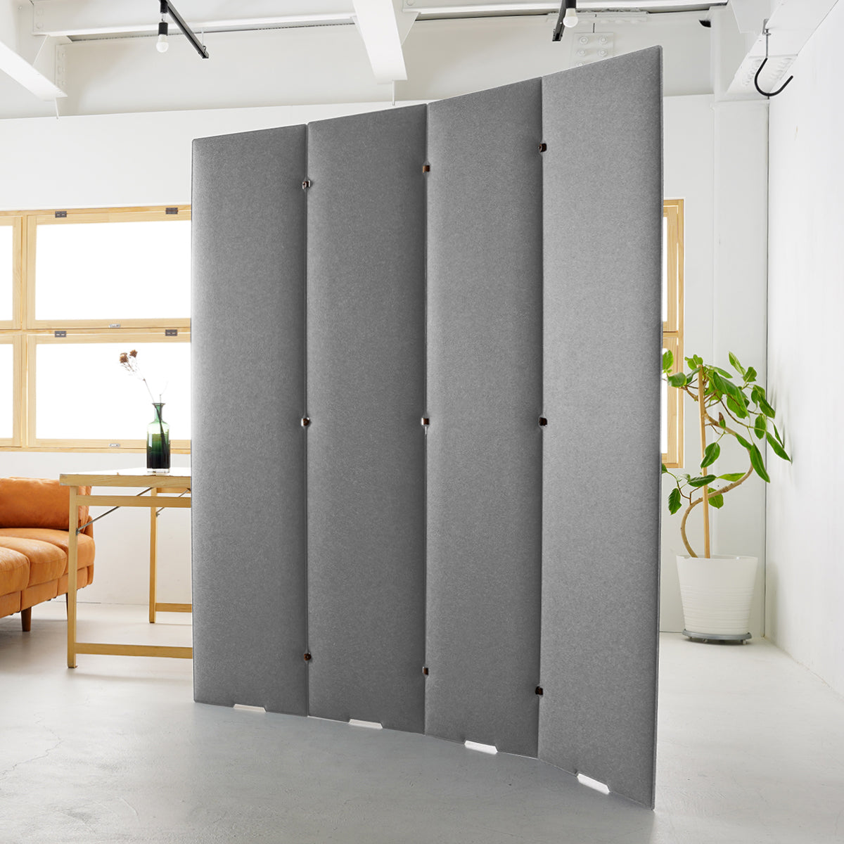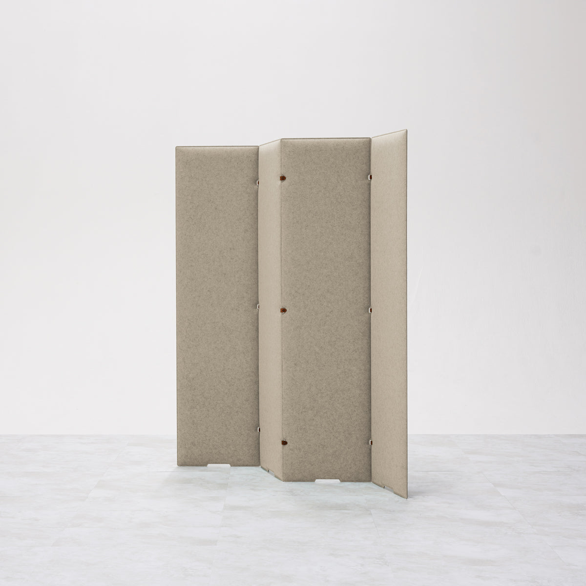 フェルトを成形した吸音パーテーション。適度の膨らみは工業用の吸音材を成形したものを使い、ザワつきや反響音を抑える。軽量で自立性があり、適度な柔らかさを持つ風合いはぶつかっても安全性は高く、住宅からオフィス、商業空間まで使用可能である。可動間仕切りとして適性の高い製品でイメージは広がる。パネルジョイントはバンド式で組立分解も簡単、シンプルな構造が良い。カラーバリエーションもあり、枚数増減も可能、幅広い用途で使用できると想像する。
