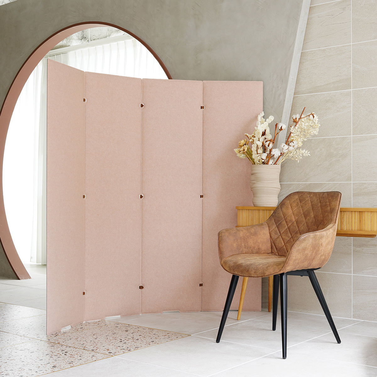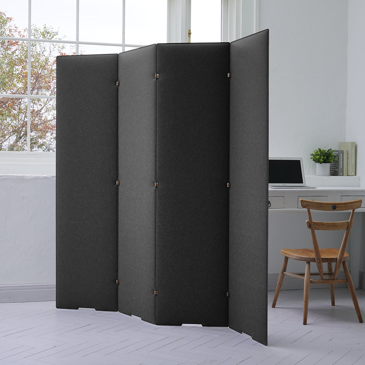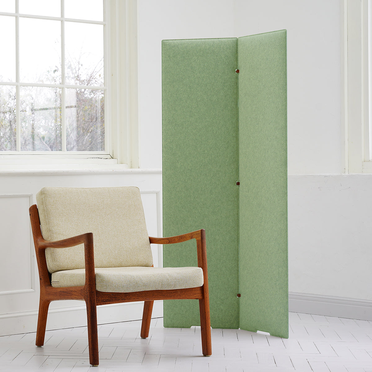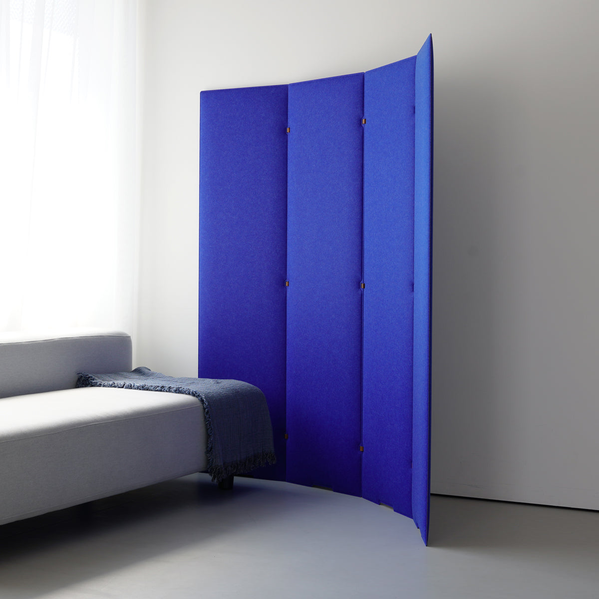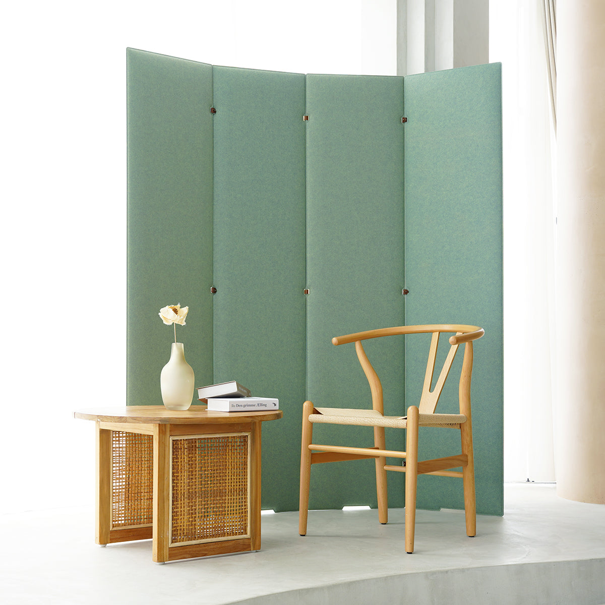 フェルトを成形した吸音パーテーション。適度の膨らみは工業用の吸音材を成形したものを使い、ザワつきや反響音を抑える。軽量で自立性があり、適度な柔らかさを持つ風合いはぶつかっても安全性は高く、住宅からオフィス、商業空間まで使用可能である。可動間仕切りとして適性の高い製品でイメージは広がる。パネルジョイントはバンド式で組立分解も簡単、シンプルな構造が良い。カラーバリエーションもあり、枚数増減も可能、幅広い用途で使用できると想像する。